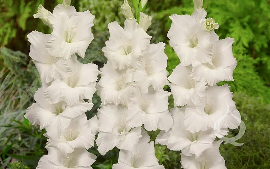 Гладиолус крупноцветковый "Бангладеш" - это великолепное растение, которое поразит вас своей красотой и изяществом. Стебель этого гладиолуса прочный и прямой, достигает высоты от 80 до 110 см, что делает его заметным акцентом в вашем саду. Листья гладиолуса имеют форму меча и создают элегантный контраст с крупными белыми цветками, слегка гофрированными по краям.