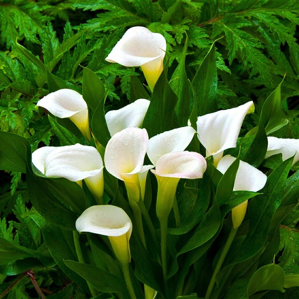 Калла белопятнистая - это изысканное растение с темно-зелеными листьями и белыми цветками, которые расцветают в марте. Ее высота достигает 50-60 см, что делает ее идеальным выбором для миксбордеров. Это растение предпочитает солнечные места и дренированные богатые почвы.