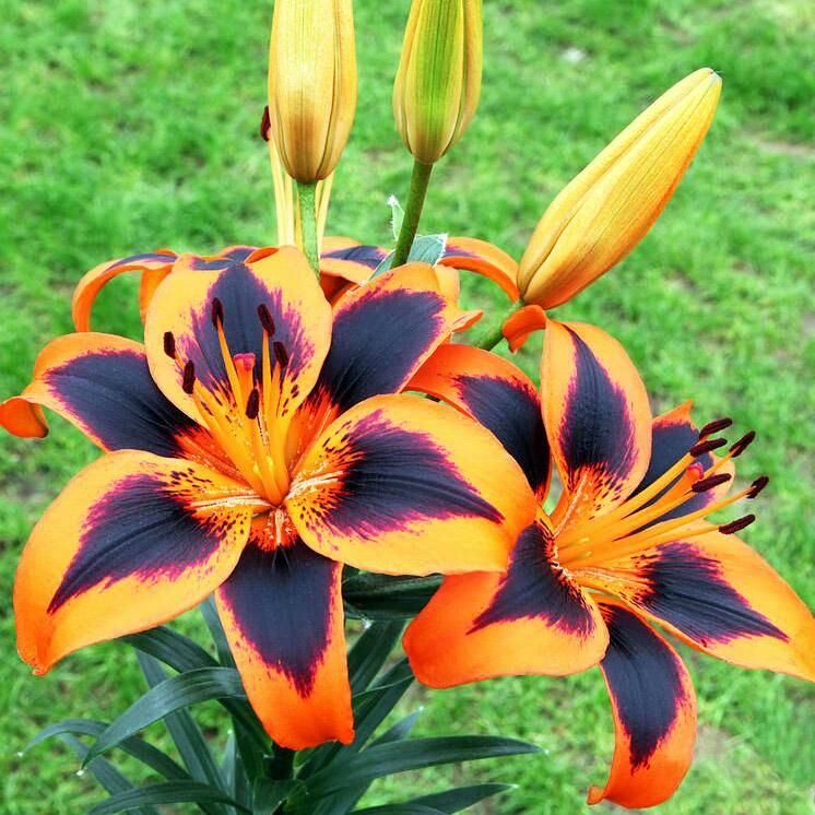 Луковицы азиатской лилии Изи Самба (Lilium asiatic Easy Samba) привлекают внимание фейерверком красок. Стебли прочные, густооблиственные, высотой до 1 м. Цветки крупные, яркой мандариновой окраски с широкими темно-бордовыми мазками и крапом, расходящимися от центра. Период цветения – июнь и июль. Длительность – до 4 недель. Лилии предпочитают солнечные, но защищенные от палящих полуденных лучей участки. Могут расти и в полутени. Хорошо развиваются на рыхлых, плодородных грунтах. Не терпят плотных, подтопляемых почв. В ландшафтном дизайне используются для украшения клумб, а также на срезку.