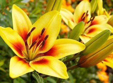 Высота стебля достигает 90 см. Цветет эта лилия в конце июня и начале июля. Цветок кремово-желтый с яркими оранжевыми акцентами ближе к центру и небольшим крапом. Этот сорт предпочитает солнечные места и выносит небольшое затенение. Лилии Тату отлично смотрятся в групповых посадках и букетах, а также подходят для выгонки.