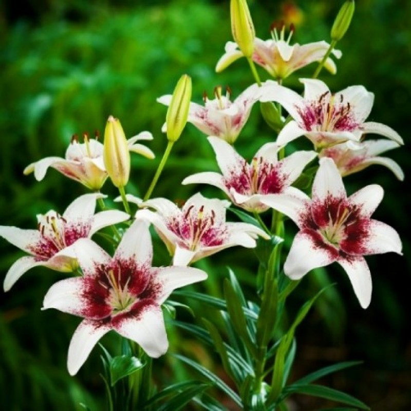 Луковицы Лилии азиатской Трайбал Кисс (Lilium asitic Tribal Kiss) ― посадочный материал для тех, кто не хочет выбирать между нежными и экспрессивными расцветками. В этом сорте объединены два оттенка: белый и насыщенный бордовый, рассыпающийся крапом по кончикам лепестков. «Изюминкой» лилии являются светло-зеленые тонкие отметины, проходящие по центру изящно выгнутых, с атласным блеском, лепестков.