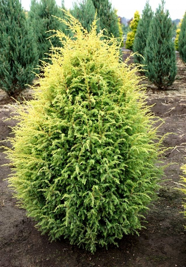 Саженцы можжевельника обыкновенного Голд Кон (Gold Cone) и крупномеры сорта имеют яркую золотисто-желтую хвою, что объясняет его название и популярность у садоводов. Красивый вечнозеленый кустарник с узкоконической кроной высотой до 200 см. Получил широкое распространение в ландшафтных композициях и групповых посадках на газонах, а также используется для оформления террас и балконов.