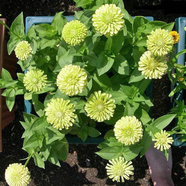 Семена цинии изящной сорта Энви порадуют всех, кто любит пышные цветы нежных расцветок. Это растение представляет собой крупный куст высотой около 60 см, на котором распускаются полушаровидные соцветия редкого зеленовато-лимонного оттенка. Правила посева семян цинии: